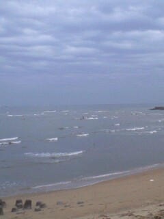 軽トラを飛ばして河口につくと・・・波高いサーフィン日和じゃん。写真まんなか かすかに見えるのが
